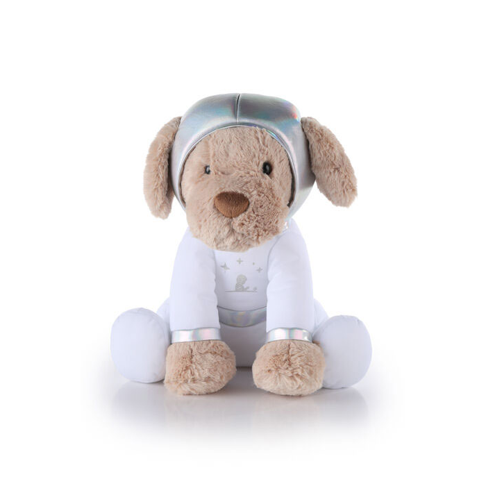 Named for St. Jude Children’s Research Hospital, Jude is a soft 15" realistic golden in a custom white spacesuit with silver accents and the hospital logo — modeled after facility dogs Puggle and Huckleberry, who comfort kids during treatment.